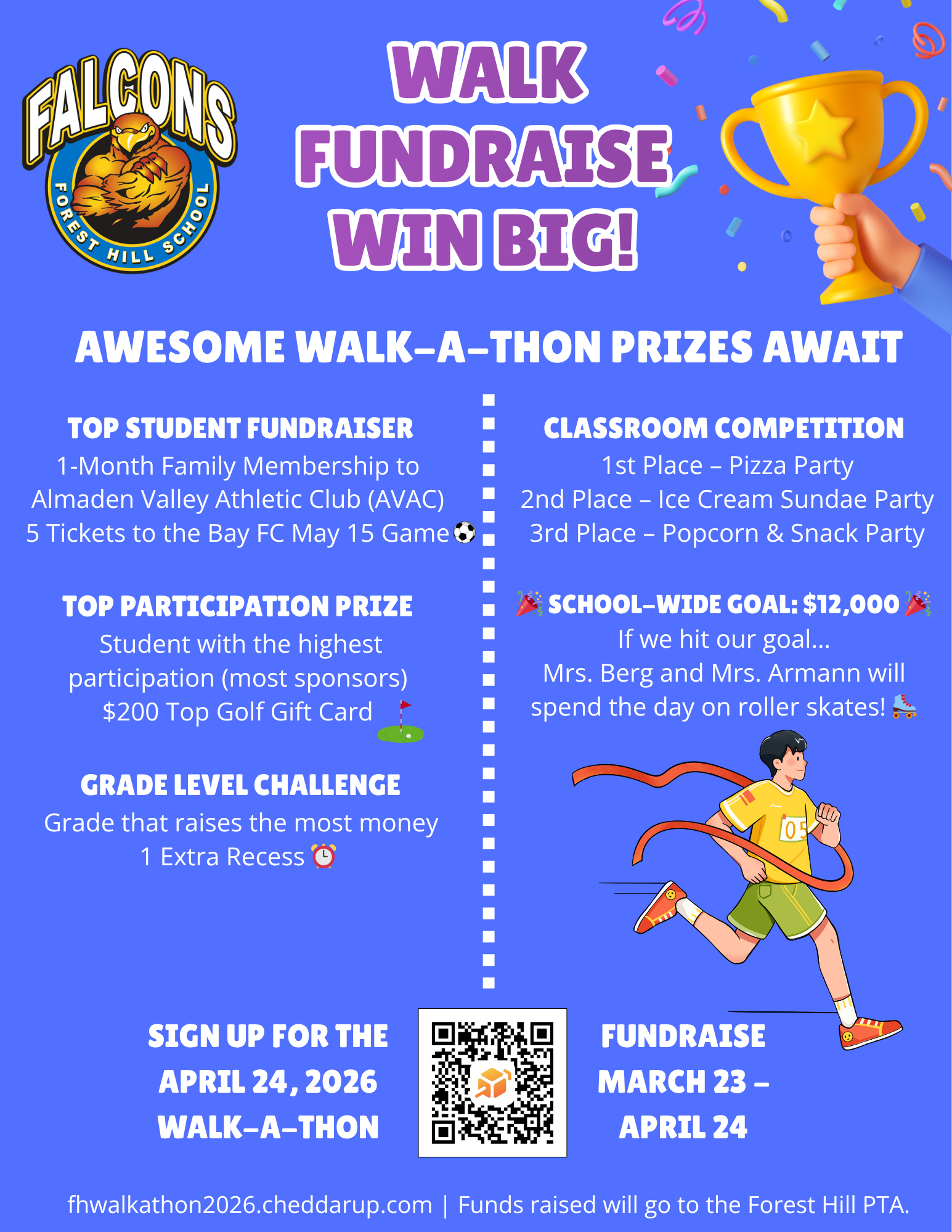 🏃♂️ Forest Hill Walk-a-Thon – April 24: Fundraising is now open as we work toward our $12,000 goal. With a parent’s help, each student can create a personalized fundraising page and invite family and friends to donate per lap or as a flat amount. Get started here!