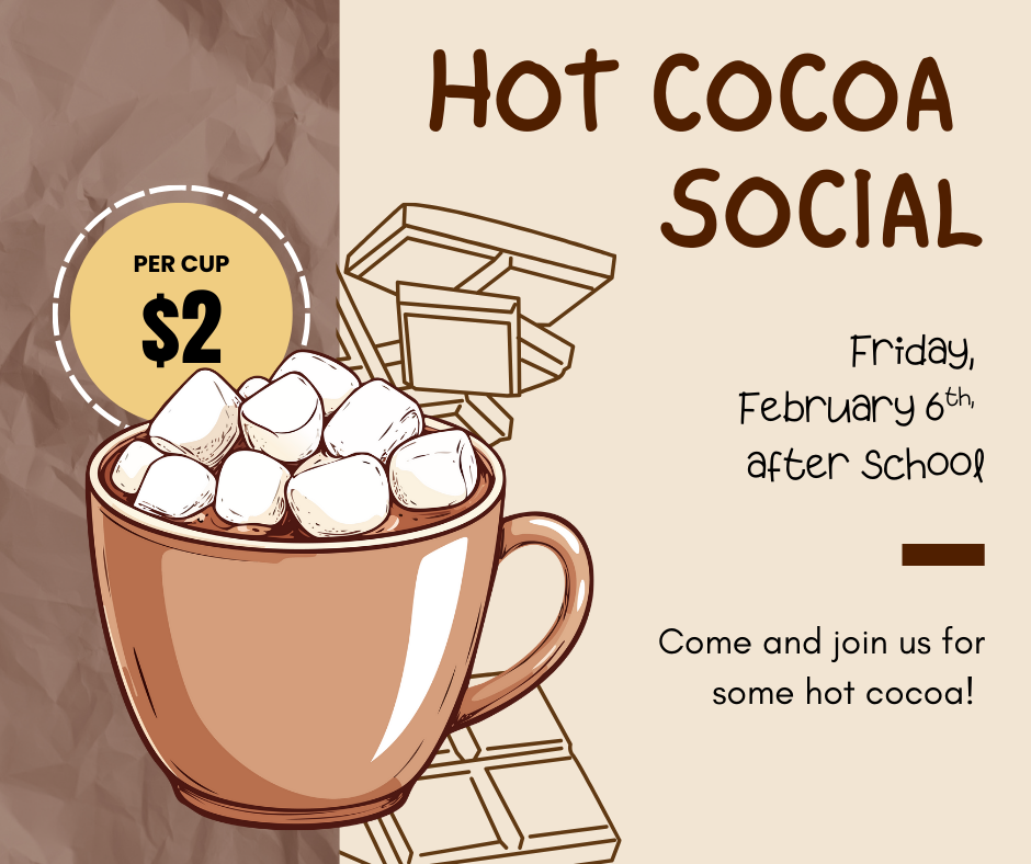 This Friday, February 6th, we’ll be hosting a Hot Cocoa Social! As usual, it will be $2 for a cup.